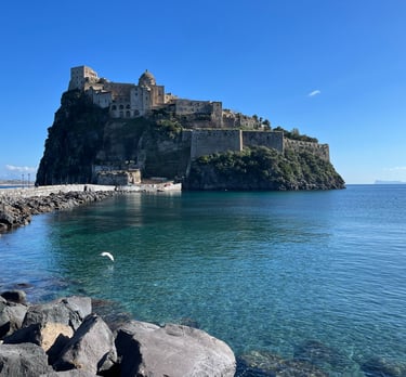 Il Castello Aragonese è il monumento simbolo dell’isola d’Ischia, costruito su un isolotto di origine vulcanica collegato alla terraferma da un ponte in pietra lungo circa 220 metri. Le sue prime fortificazioni risalgono al 474 a.C., ma fu Alfonso d’Aragona nel Quattrocento a trasformarlo nella maestosa struttura che conosciamo oggi.